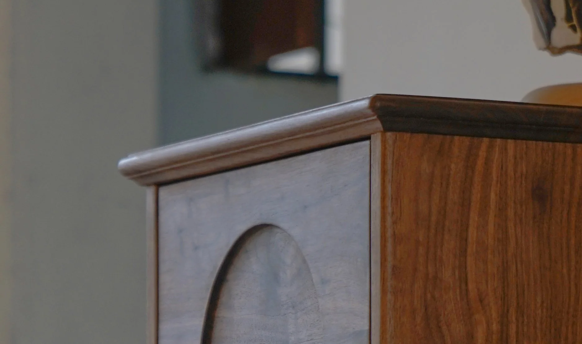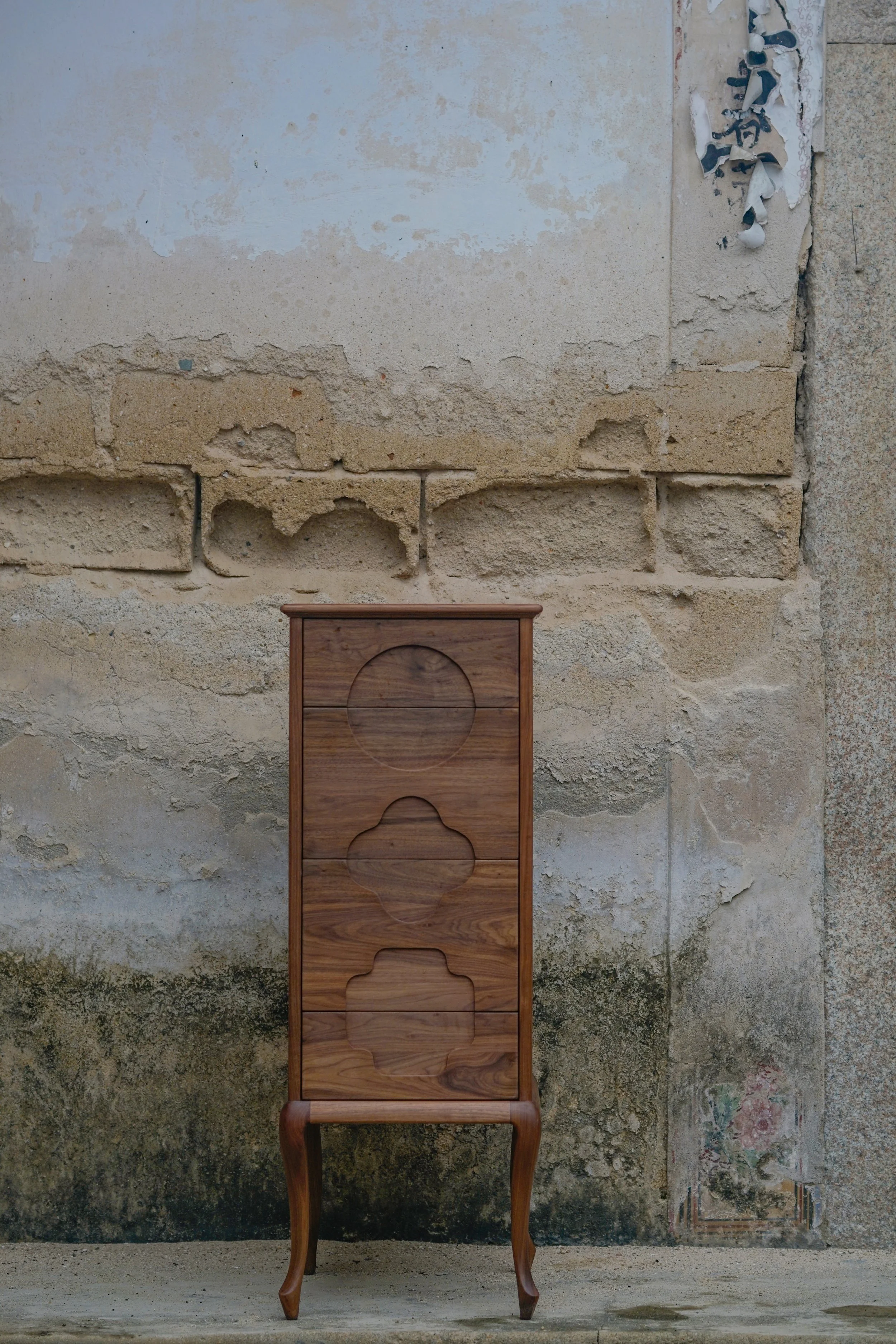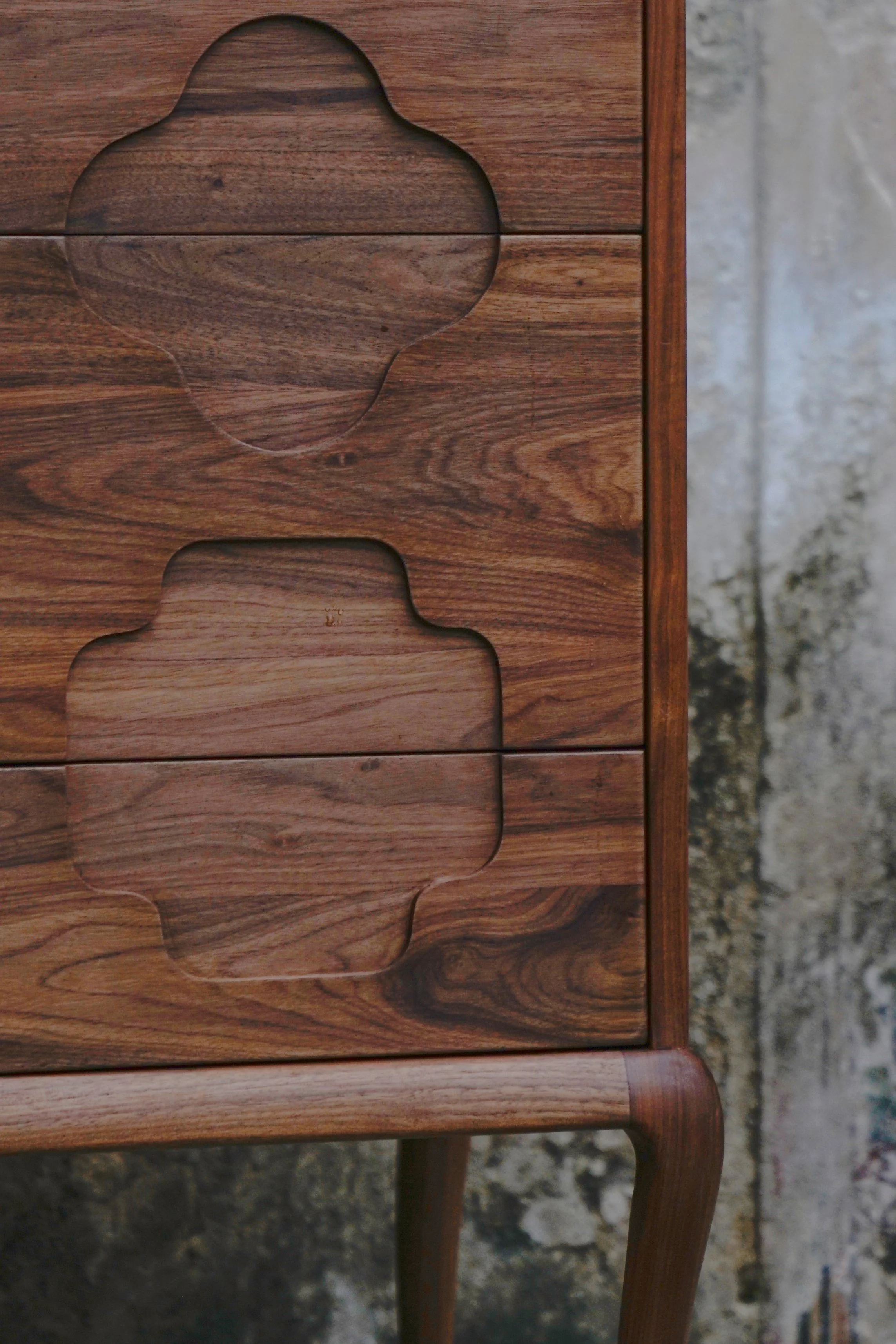 这件作品运用了“文化可示”的创作手法,将传统文化变成看得见的产品,成为生活中可以欣赏的对象。“茶三酒四踢桃二”是潮汕地区特有的一种文化习俗,意为喝工夫茶的理想人数是三,饮酒为四人,游玩最好是两人,我们将它凝固在:四个抽屉、三个图案、左右两条鹤腿之中。柜子通体用胡桃木制成,比例按照黄金分割调整,图案来自于古代园林的窗型。